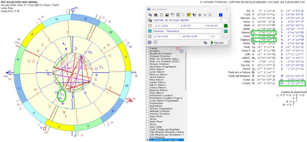 Posteriormente, analicé la carta natal de Venezuela casi rectificada utilizando atacires sociales, llegando a la conclusión de que la ejecución del evento se produciría a finales de octubre de 2025. Sin embargo, fue necesario que transcurrieran dos meses adicionales para que la predicción basada estrictamente en la Carta Astral de Venezuela se manifestara plenamente. Este desfase temporal sugiere la necesidad de rectificar la carta natal de Venezuela algunos minutos, un ajuste habitual en astrología mundana cuando los eventos se confirman, pero el tiempo exacto presenta una leve variación.